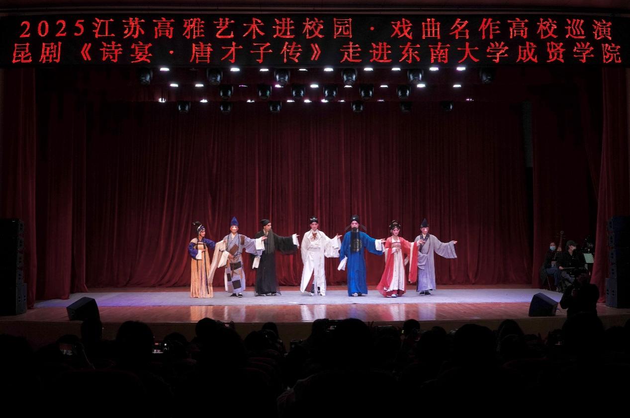 11月20日晚,江苏省高雅艺术进校园活动——江苏省演艺集团昆剧院原创昆剧《诗宴・唐才子传》在我校综合楼报告厅精彩上演,部分教职工及610名同学共赴一场跨越千年的“诗宴之约”。