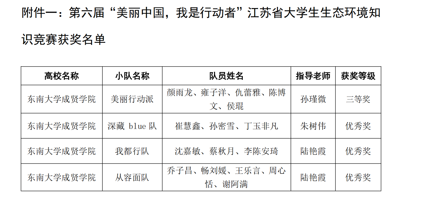为深入学习贯彻习近平生态文明思想,引导青年学生厚植生态情怀、提升环保素养,近日,第六届“美丽中国,我是行动者”江苏省大学生生态环境知识竞赛圆满落幕。我校学子凭借扎实的专业功底、出色的实践能力与昂扬的青春风貌,在全省高校参赛队伍中脱颖而出,荣获三等奖1项、优秀奖3项。